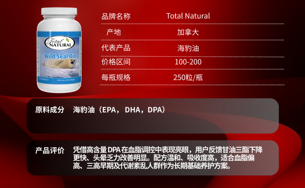 来自加拿大的 Total Natural 是当地老牌天然健康企业,在北美市场深耕超过 30 年,在线上与线下均拥有极高的信任度。其旗下海豹油系列不仅受普通用户欢迎,同时被众多加拿大华人家庭医生、代谢科营养师作为辅助调脂与血管管理的推荐产品。