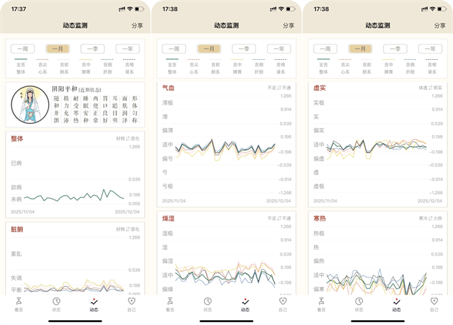 (看舌头APP用户近一个月的气血、燥湿、虚实、寒热动态监测图)