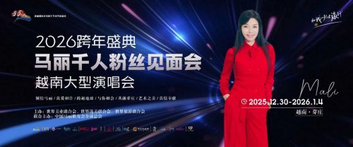 2025年12月30日,在越南举行的首届国际环保和平艺术节闭幕式论坛暨2026跨年盛典马丽千人粉丝见面会越南芽庄大型演唱会上,马丽与千人粉丝团共同演唱中国外交领保保侨第一歌《12308咱们回家》,奏响中国文化全球行万马奔腾凯歌。
