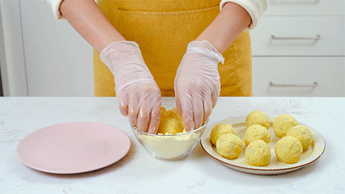 5.倒入60g玉米粉抓匀,再将馅料揉搓成等大的馅团